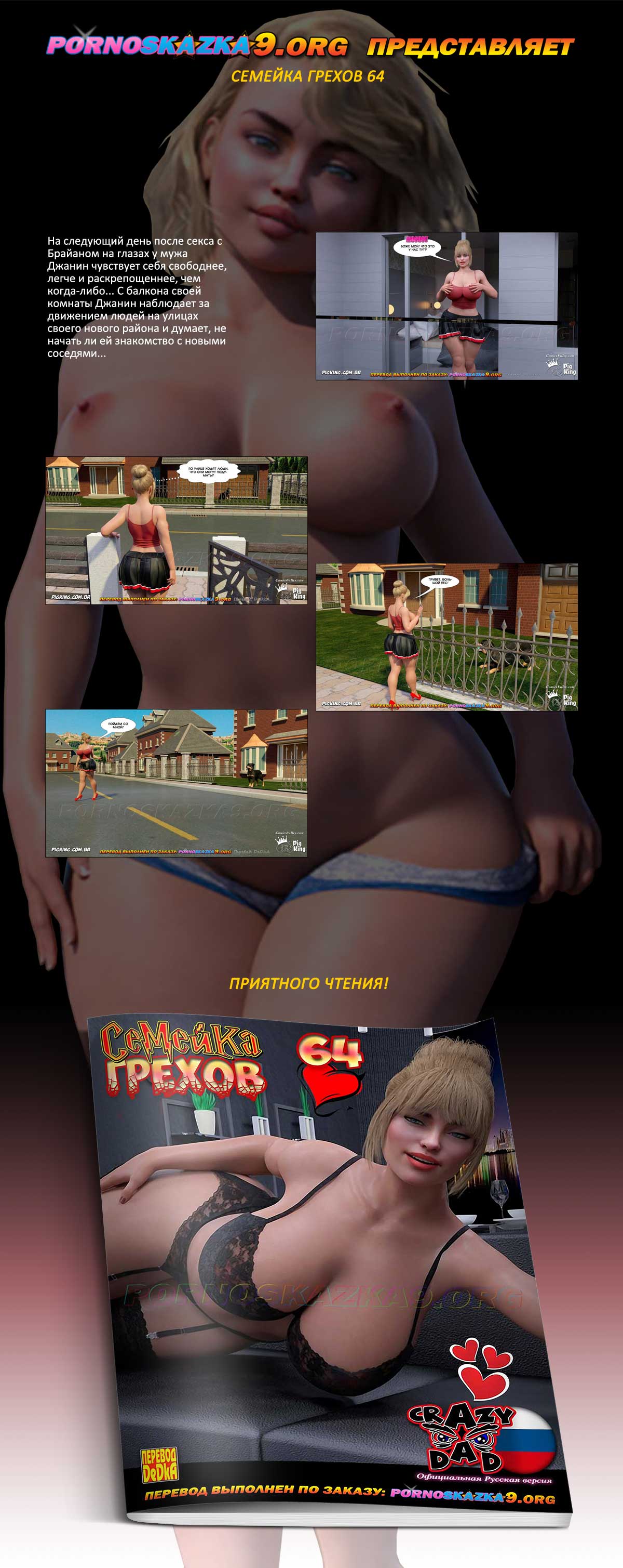 Порно комикс «Семейка грехов. Часть 64.» На следующий день после секса с Брайаном на глазах у мужа Джанин чувствует себя свободнее, легче и раскрепощеннее, чем когда-либо… С балкона своей комнаты Джанин наблюдает за движением людей на улицах своего нового района и думает, не начать ли ей знакомство с новыми соседями…